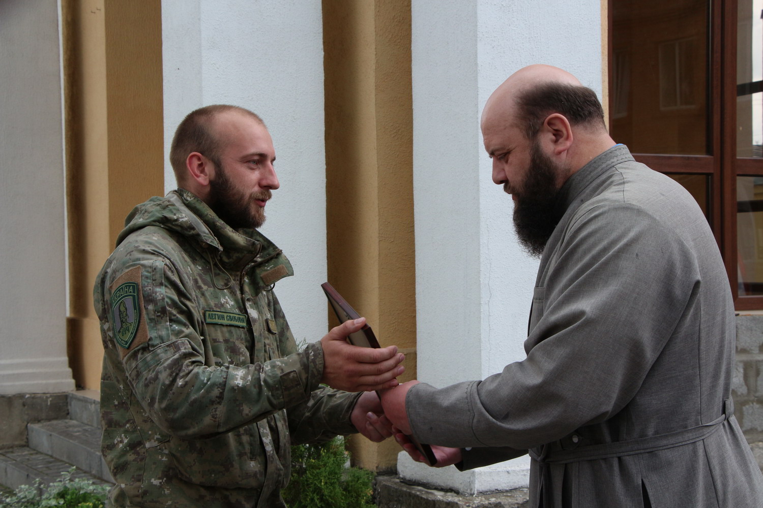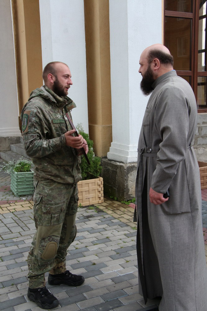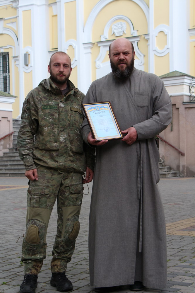 1 липня 2015 р. Командир роти добровольчого батальйону «Січ» Максим Морозов вручає подяку митрополиту Луцькому і Волинському Михаїлу за молитви та передану матеріальну допомогу. Світлини інформаційної служби єпархії.