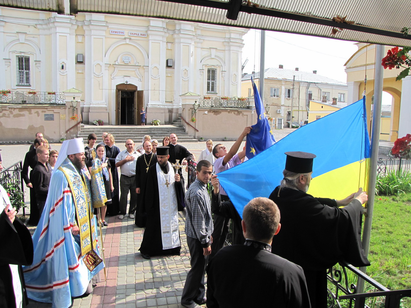 23 серпня 2012 р. З нагоди Дня Прапора митрополит Луцький і Волинський Михаїл у кафедральному соборі Святої Трійці освячує прапори – єпархіальні, державний і Євросоюзу, які після цього замайоріли на соборному майдані, перед духовною консисторією. Світлини інформаційної служби єпархії.