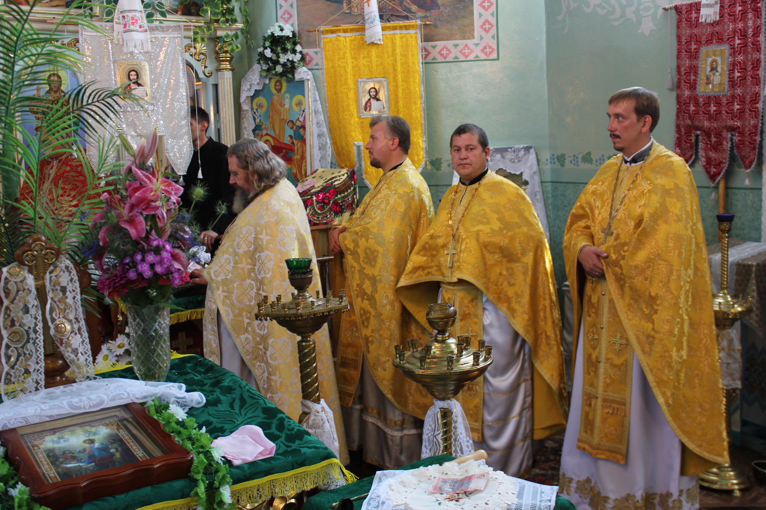 6 серпня 2013 р. Божественна Літургія у храмі Успіння Пресвятої Богородиці с. Стенжаричі Володимирського районного деканату з нагоди дня ангела і 20-річчя священичого служіння настоятеля протоієрея Бориса Гідзінського. Відправу очолює єпископ Володимир-Волинський Матфей. Світлини з архіву владики.