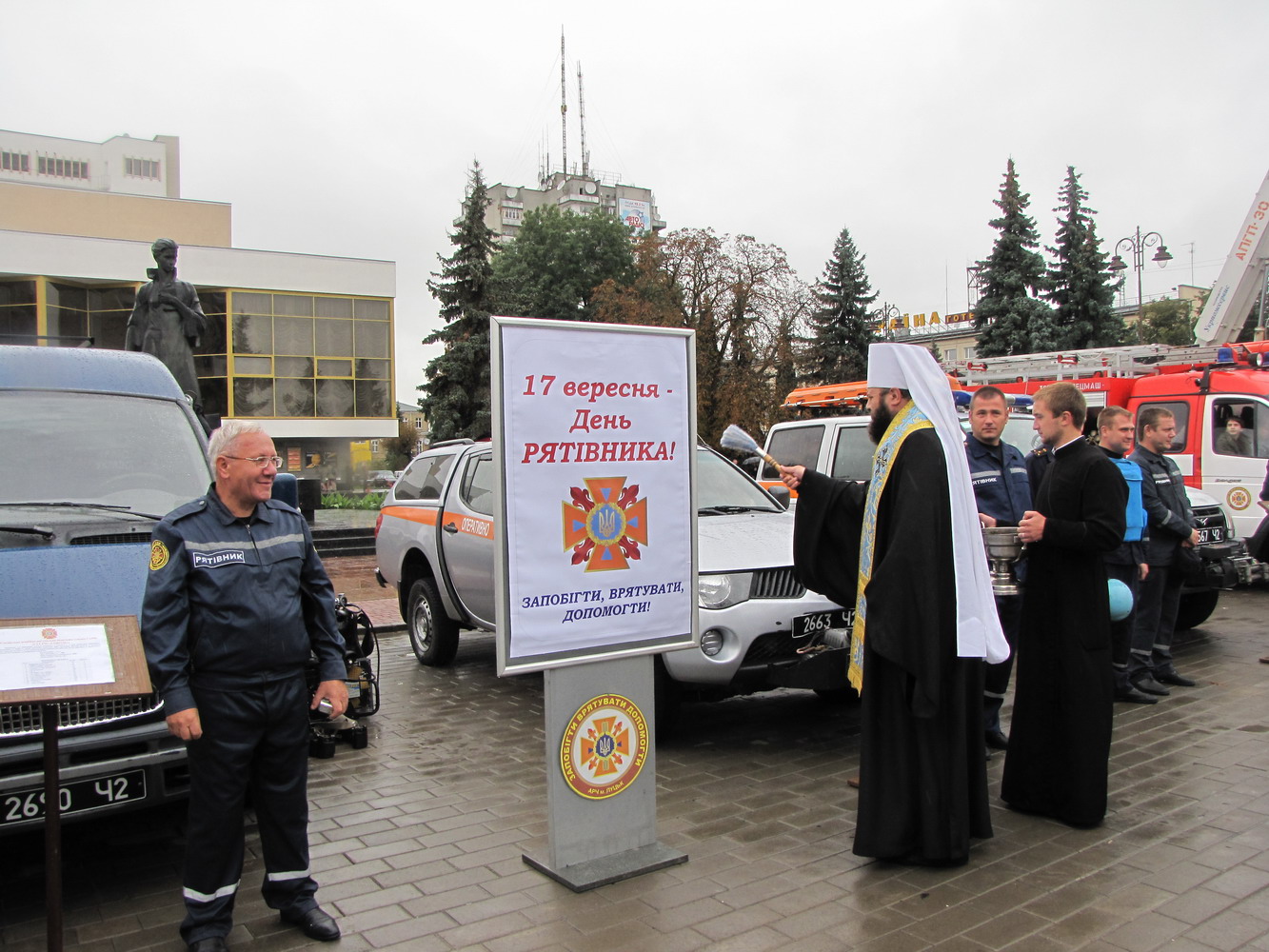 13 вересня 2013 р. Подячний молебень у кафедральному соборі Святої Трійці та окроплення освяченою водою техніки на Театральному майдані обласного центру на прохання Управління Державної служби України з надзвичайних ситуацій України у Волинській області. Богослужіння очолює митрополит Луцький і Волинський Михаїл. Світлини інформаційної служби єпархії.