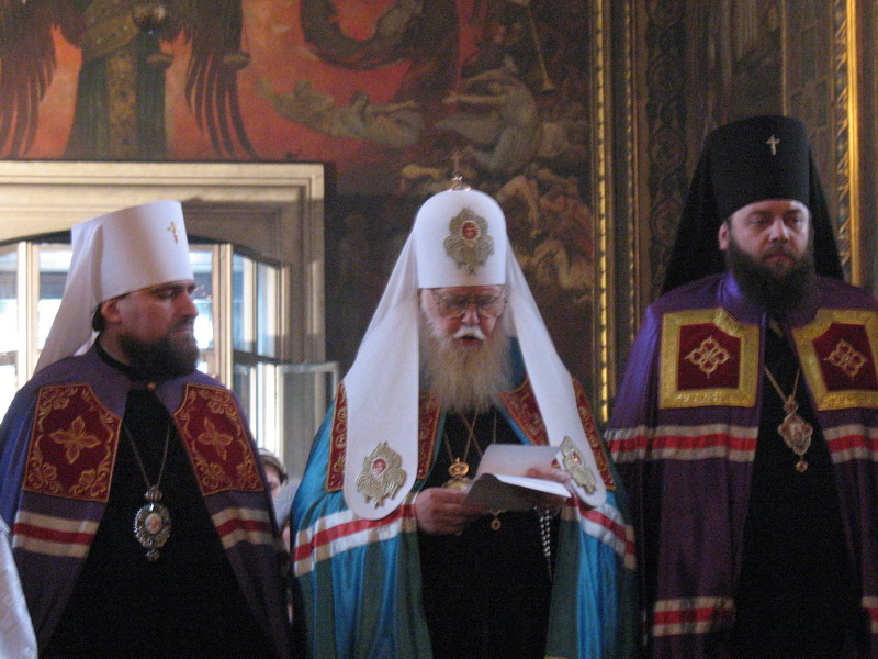 1 лютого 2009 р. Патріарх Філарет читає слово при врученні архієрейського жезла нововисвяченому єпископові Марку (Левківу). Зліва від Патріарха – митрополит Димитрій, справа – архієпископ Михаїл. Світлина ієромонаха Якова (Мільяна)