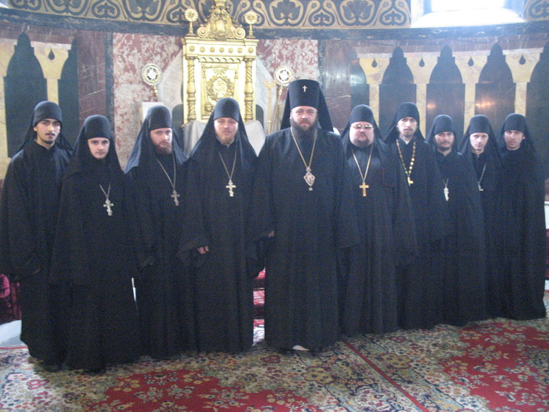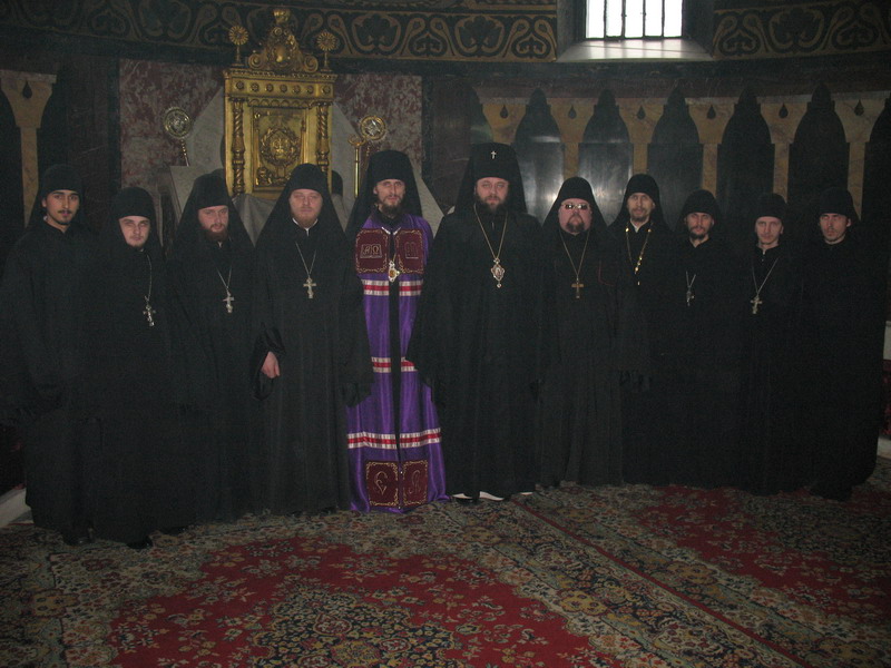 1 лютого 2009 р. Архієпископ Луцький і Волинський Михаїл (у центрі), нововисвячений єпископ Кіровоградський і Голованівський Марк (зліва від владики Михаїла) із волинськими ченцями, які прибули на Божественну Літургію у Володимирський собор Києва з нагоди архієрейської хіротонії. Справа від архієпископа – намісник Замкового монастиря Архангелів у Луцьку ігумен Святополк (Канюка) і намісник обителі Святителя Миколая Чудотворця в с. Жидичин Ківерецького деканату ієромонах Константин (Марченко). Світлина ієромонаха Якова (Мільяна)