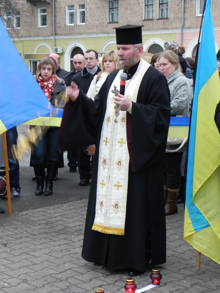 23 листопада 2013 р. Мітинг-реквієм на майдані Незалежності у Нововолинську з нагоди 80-ї річниці Голодомору. Очолює декан протоієрей Стефан Фульмес. Світлини з архіву священика.