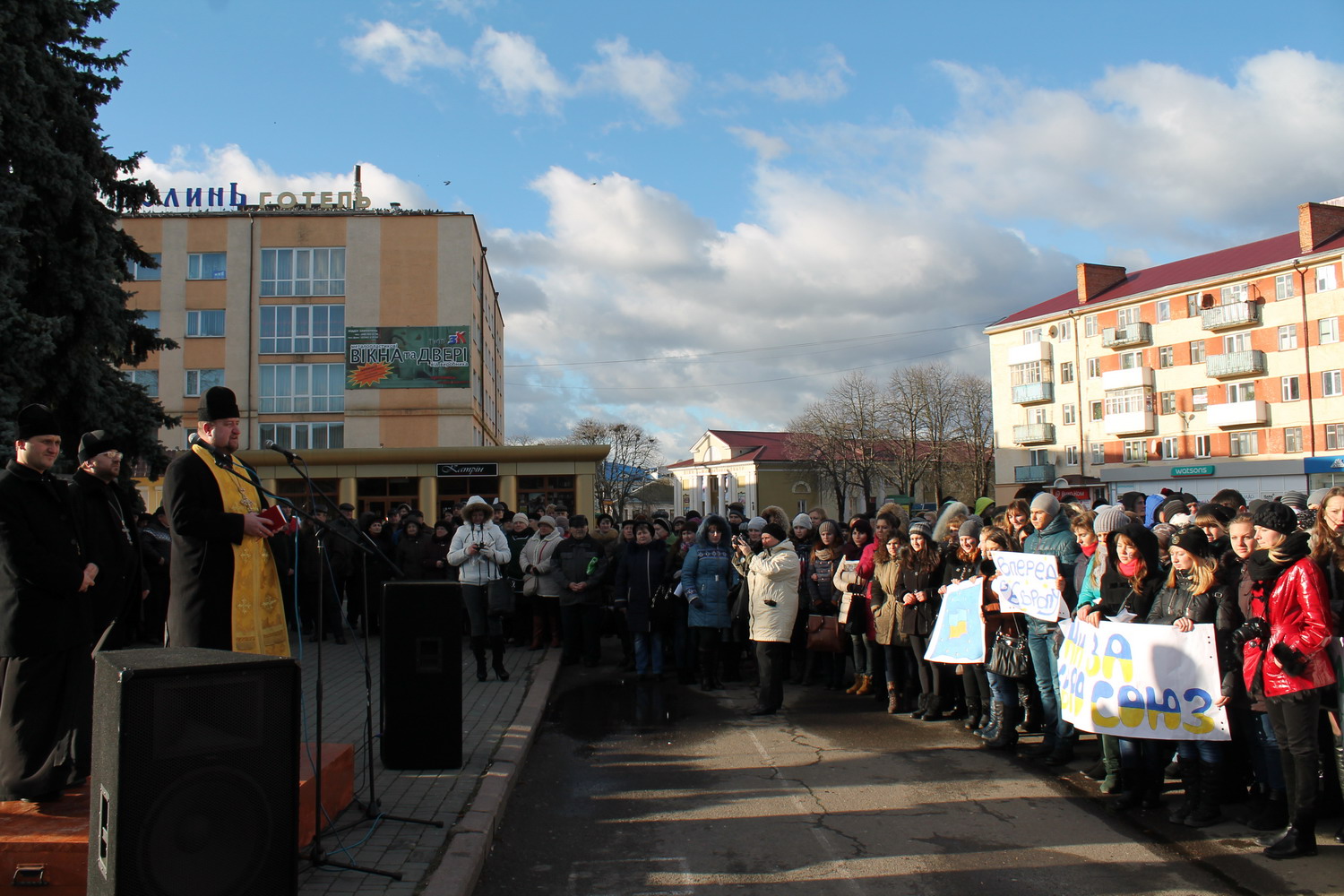 2 грудня 2013 р. Молитва за Україну у Володимирі під час народного віче на підтримку Євромайдану у Києві. Очолює міський декан протоієрей Юрій Пилипець. Світлини з архіву протоієрея Ігоря Бігуна.