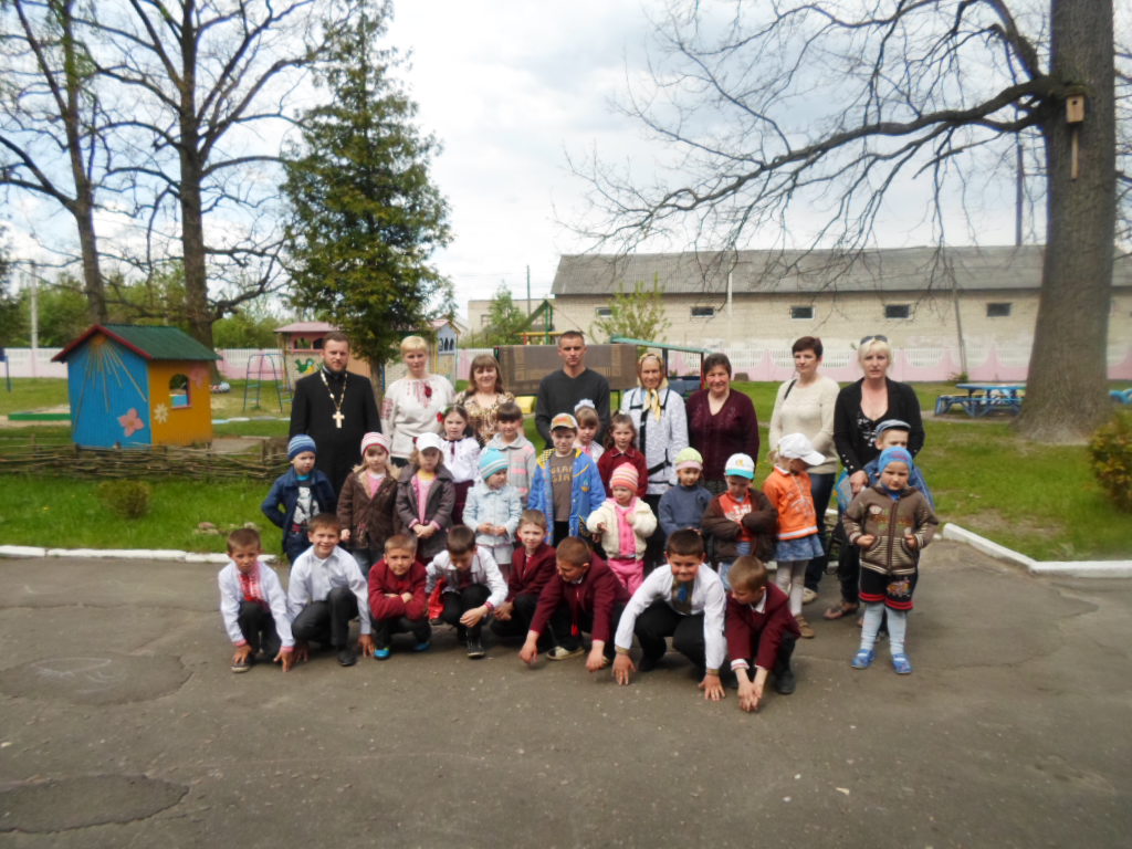 29 квітня 2014 р. Священик Євген Рудь, настоятель парафії Апостолів Петра і Павла в с. Сокиричі Ківерецького деканату з учителем місцевої школи Валентиною Кавкою та учнями другого класу вітають з Великоднем вихованців дитячого будинку «Сонечко». Світлини з архіву священика.