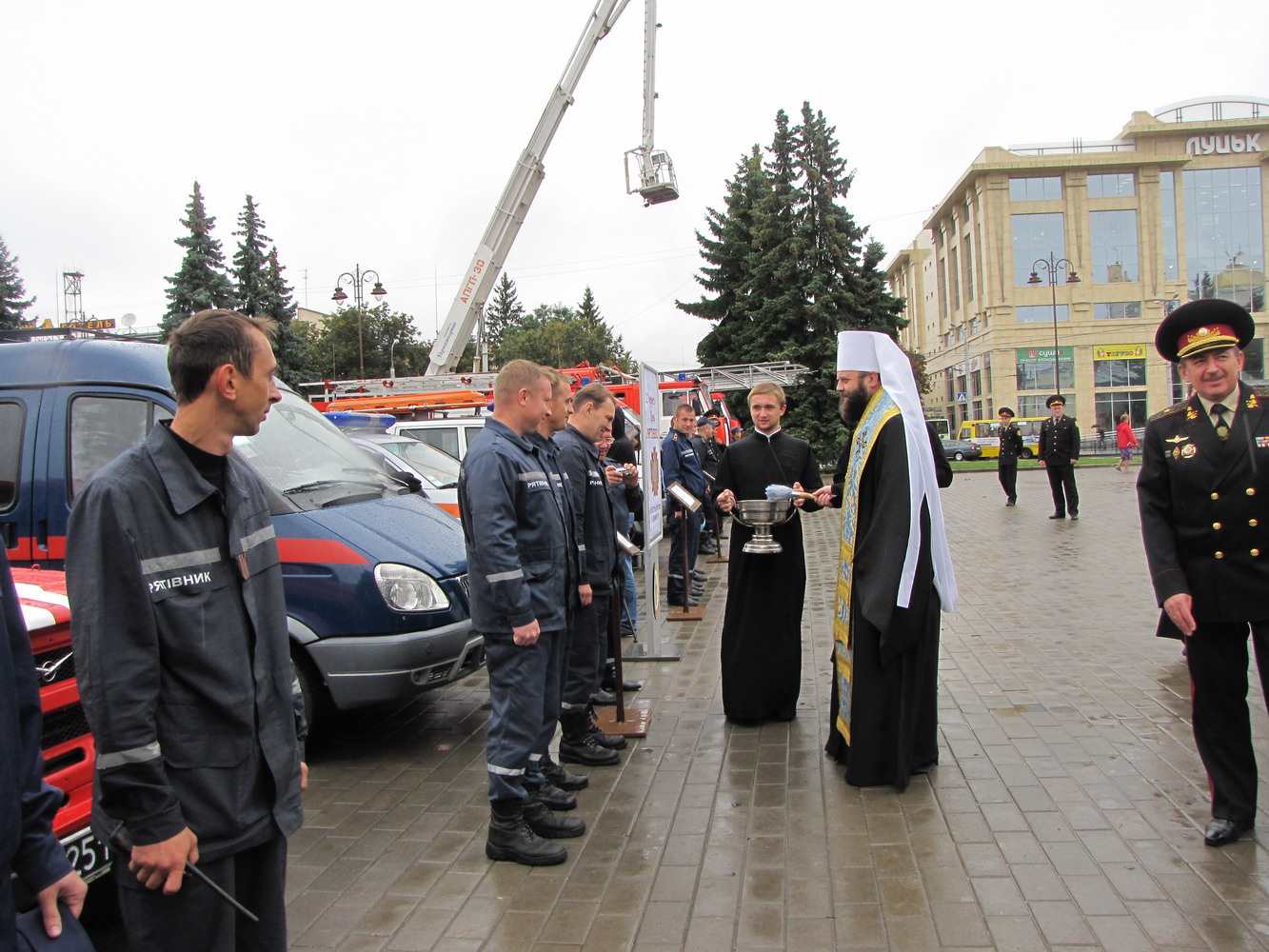 13 вересня 2013 р. Подячний молебень у кафедральному соборі Святої Трійці та окроплення освяченою водою техніки на Театральному майдані обласного центру на прохання Управління Державної служби України з надзвичайних ситуацій України у Волинській області. Богослужіння очолює митрополит Луцький і Волинський Михаїл. Світлини інформаційної служби єпархії.