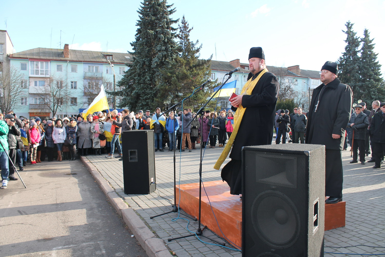 2 грудня 2013 р. Молитва за Україну у Володимирі під час народного віче на підтримку Євромайдану у Києві. Очолює міський декан протоієрей Юрій Пилипець. Світлини з архіву протоієрея Ігоря Бігуна.