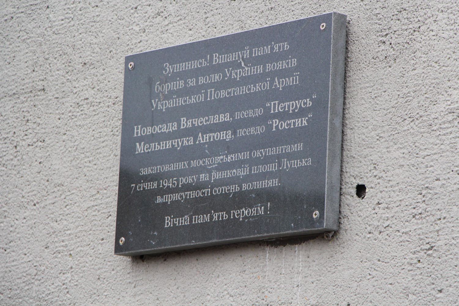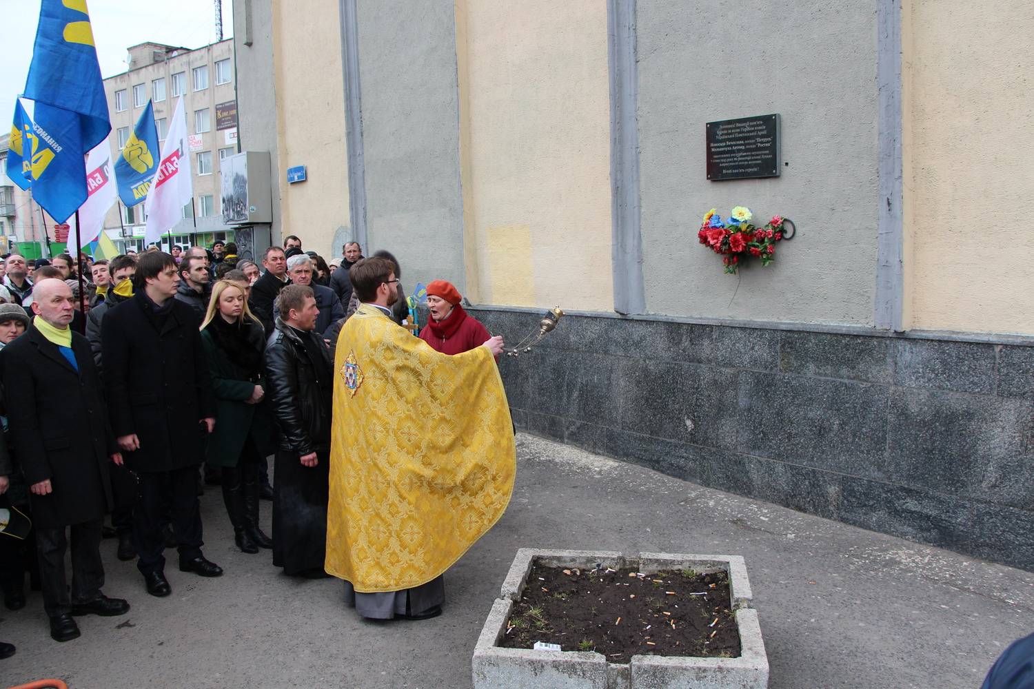 16 лютого 2014 р. Заупокійна літія біля меморіальної дошки по борцях за волю України вояках української Повстанської Армії Вячеслава Новосада та Антона Мельничука, закатованих московськими окупантами 7 січня 1945 р. на ринковій площі Луцька. Очолює клірик братського храму Воздвиження Хреста Господнього у Луцьку священик Ярослав Черенюк. Світлини інформаційної служби єпархії.