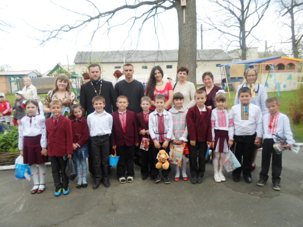 29 квітня 2014 р. Священик Євген Рудь, настоятель парафії Апостолів Петра і Павла в с. Сокиричі Ківерецького деканату з учителем місцевої школи Валентиною Кавкою та учнями другого класу вітають з Великоднем вихованців дитячого будинку «Сонечко». Світлини з архіву священика.