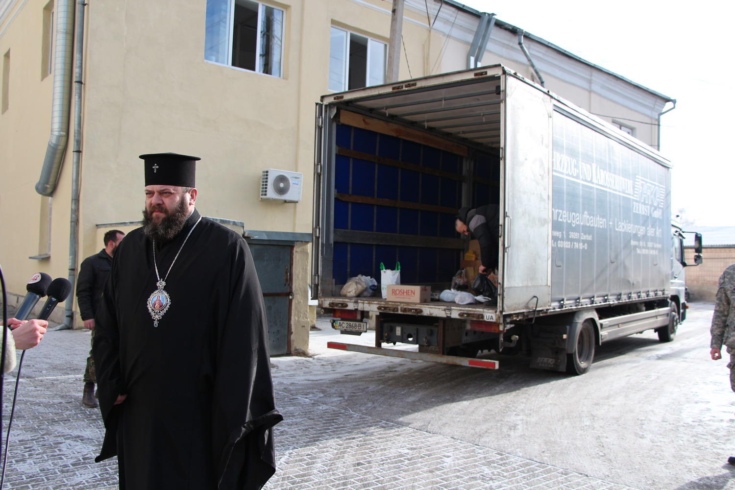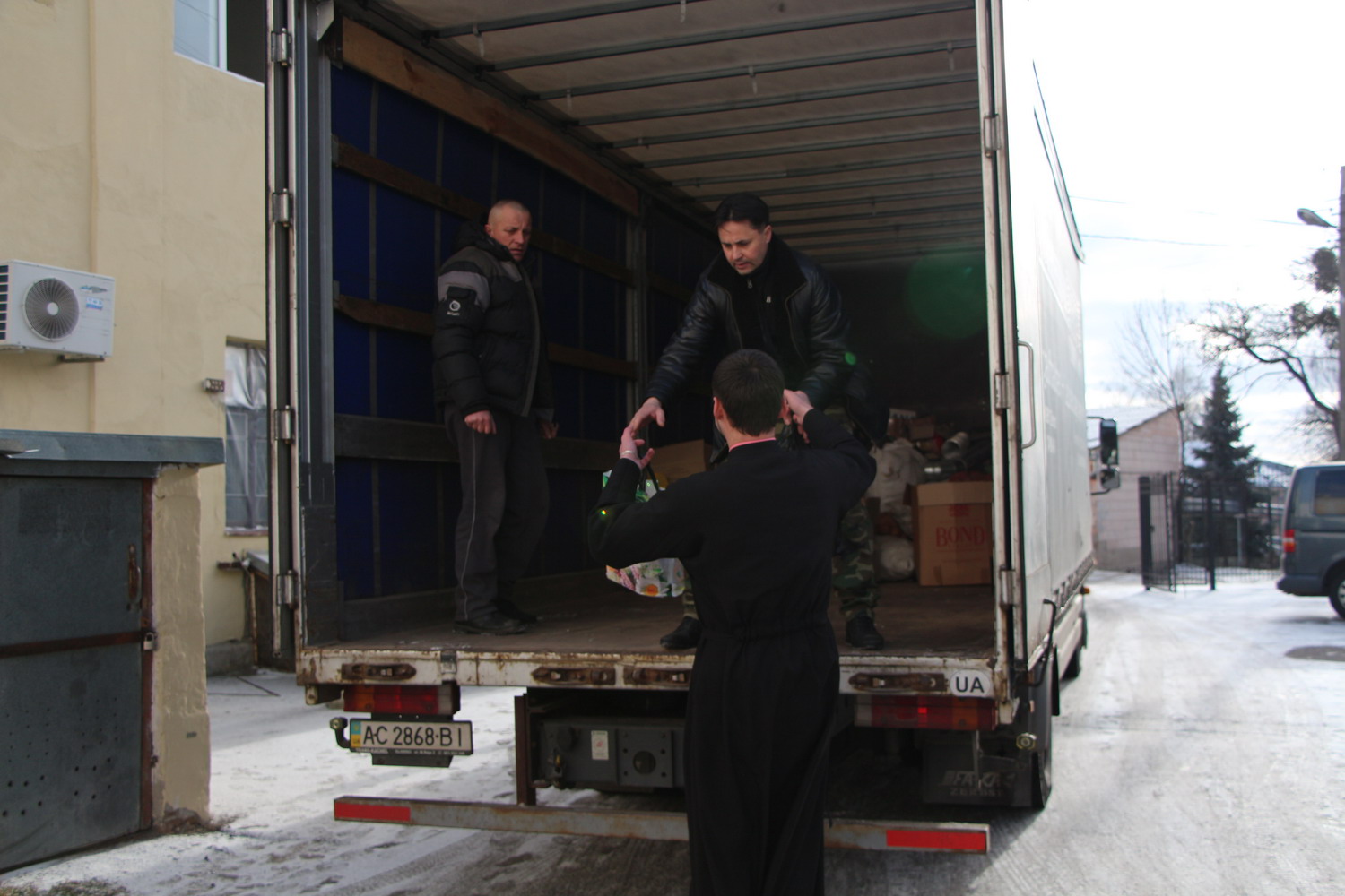 10 лютого 2015 р. Відправка чергового гуманітарного вантажу від парафіян кафедрального собору Святої Трійці для військовослужбовців у зоні АТО. Світлили інформаційної служби єпархії.