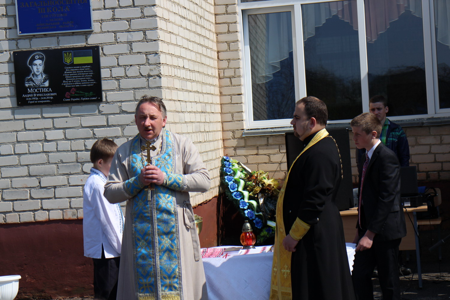 24 квітня 2015 р., с. Зелена Ковельського районного деканату. Відкриття меморіальної дошки Андрію Мостиці, який загинув у зоні АТО. Очолює протоієрей Віктор Марчишак. Світлини з архіву протоієрея Володимира Удуда.